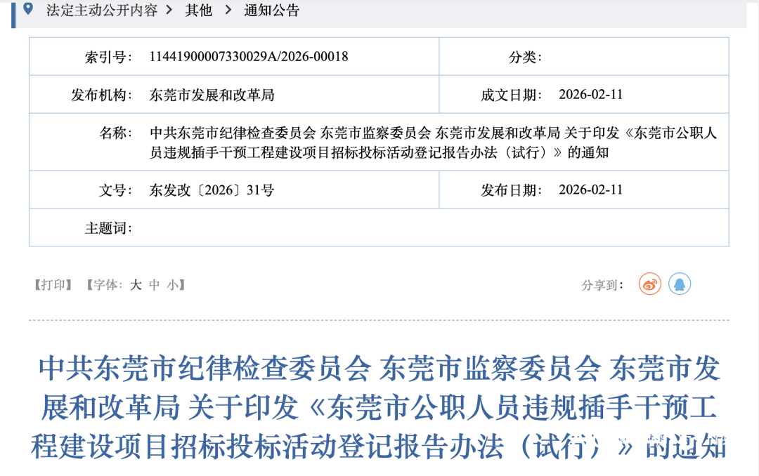 为防止公职人员违规插手干预工程建设项目招标投标活动,近日,中共东莞市纪律检查委员会、东莞市监察委员会、东莞市发展和改革局联合印发《东莞市公职人员违规插手干预工程建设项目招标投标活动登记报告办法(试行)》(以下简称《办法》),其中详细列举了21种违规行为。该《办法》旨在为公职人员行为划出清晰“红线”,建立登记报告制度,确保工程招投标活动公平、公正、公开。
