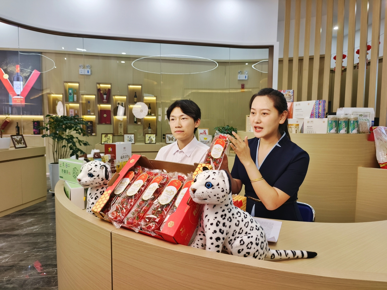 在京东民乐优选特产馆线下体验店,主播们正在推介民乐串番茄